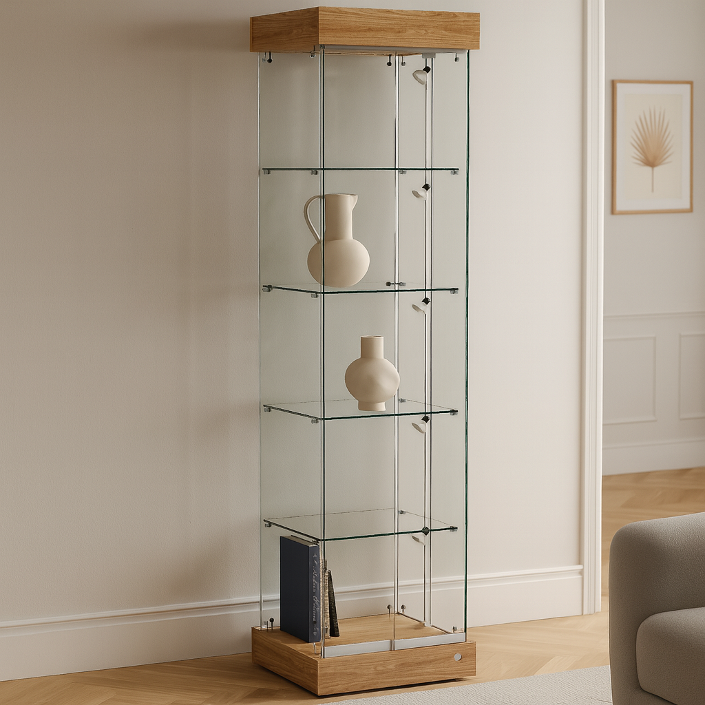 Gablota szklana AL 2 to minimalistyczna i stylowa witryna ekspozycyjna, idealna do sklepów, biur, muzeów oraz wnętrz domowych. Konstrukcja ze szkła float z polerowanymi krawędziami oraz przesuwne drzwi zamykane na klucz zapewniają bezpieczeństwo i estetyczną prezentację kolekcji, dekoracji czy produktów butikowych. Dzięki prostemu designowi i szerokiemu wyborowi dekorów płyt, gablota znakomicie komponuje się z aranżacjami nowoczesnymi, butikowymi, skandynawskimi i biurowymi.