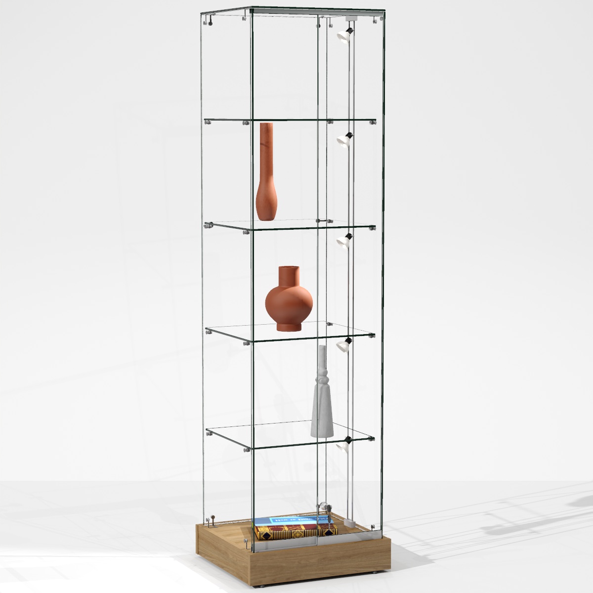 Cztery stabilne półki umieszczone na wspornikach z gumowymi podkładkami chronią eksponaty przed przesunięciem.