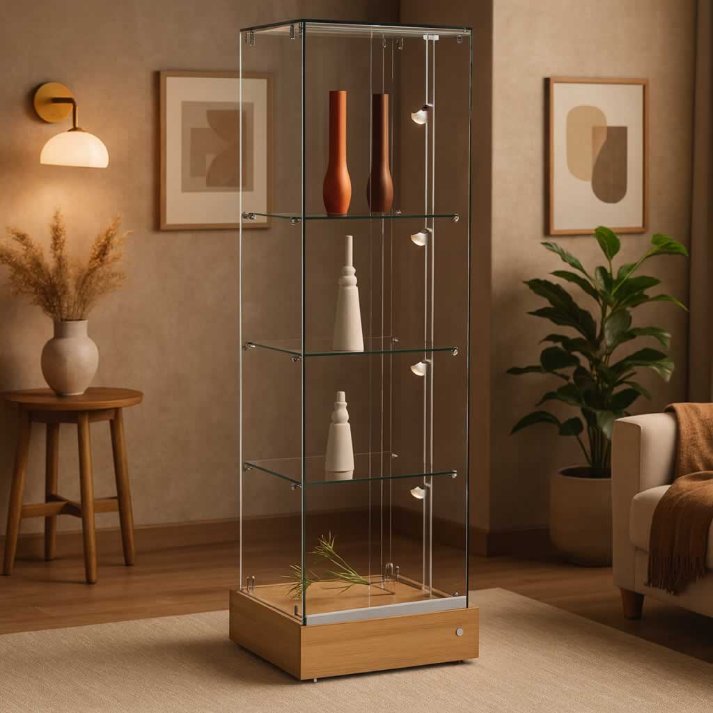 Oświetlenie LED: Opcjonalnie boczne lub podpółkowe oświetlenie LED — podkreśla eksponaty subtelnym światłem.