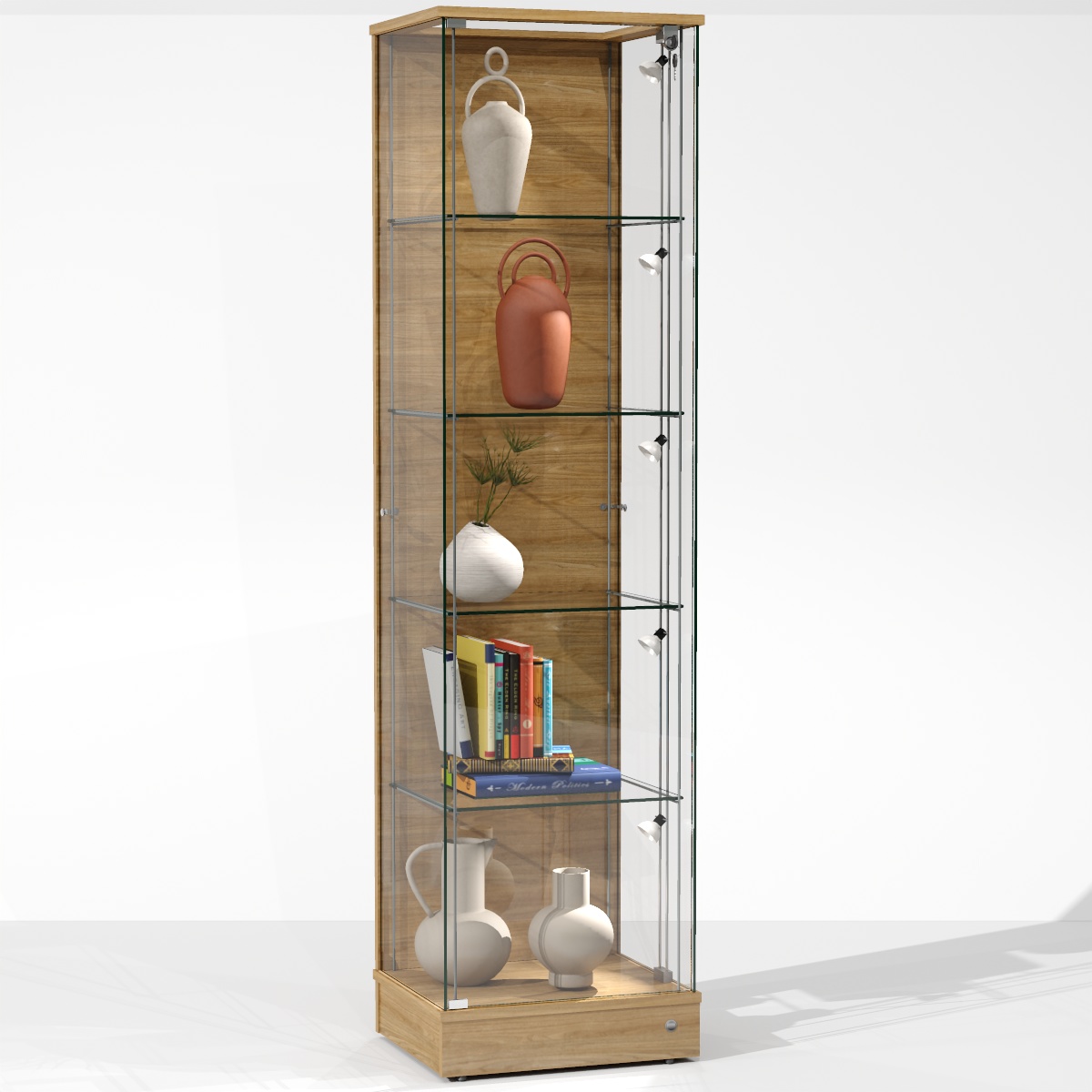 Gablota szklana PO 2‑P‑R to witryna szklana w stylu loft ze szkłem przeszklonym z trzech stron, górnym przeszkleniem doświetlającym wnętrze i bocznym oświetleniem każdej półki, pełne plecy z płyty, elegancka gablota szklana idealna do ekspozycji muzealnej, sklepowej lub domowej w stylu hyge.
