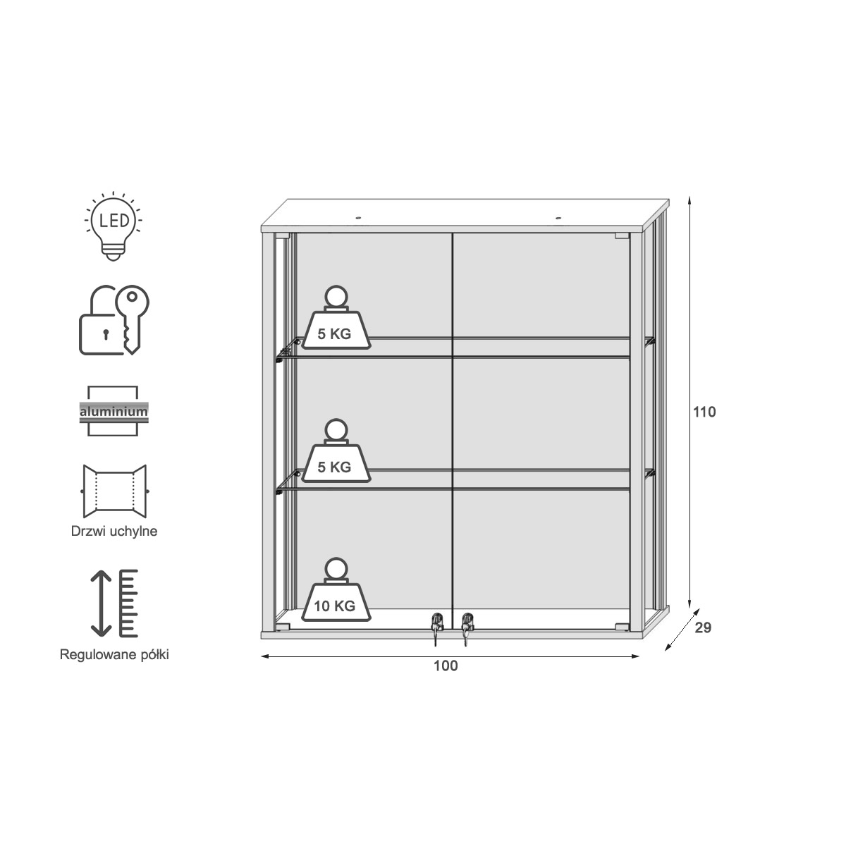 Gablota wisząca VA 11W 100 to stylowa gablota wisząca ze szkłem, która została zaprojektowana z myślą o ekspozycji wyższych przedmiotów i kolekcji wymagających większej wysokości. Przeszklona konstrukcja trójstronnie zapewnia pełną widoczność, a smukła głębokość pozwala zagospodarować przestrzeń ściany bez utraty funkcjonalności. Doskonała jako gablota wisząca meble sklepowe, gablota wisząca wyposażenie sklepów oraz jako element wystroju w gabinetach lekarskich i salonach kosmetycznych, gdzie liczy się profesjonalny wygląd i funkcjonalna ekspozycja.