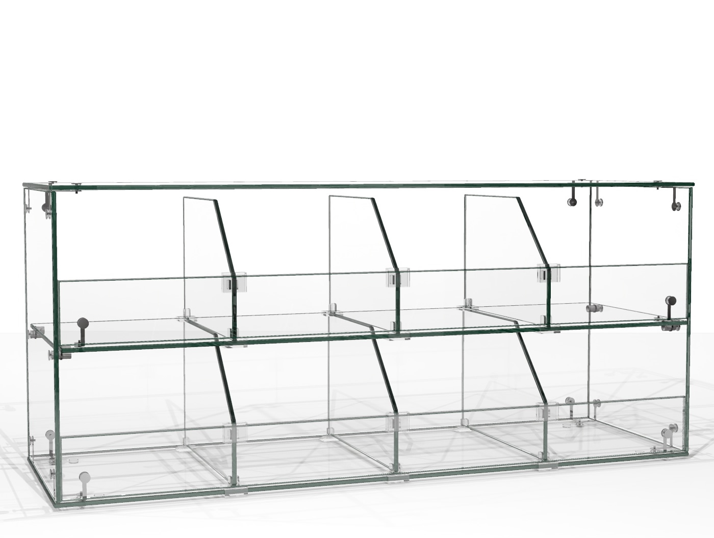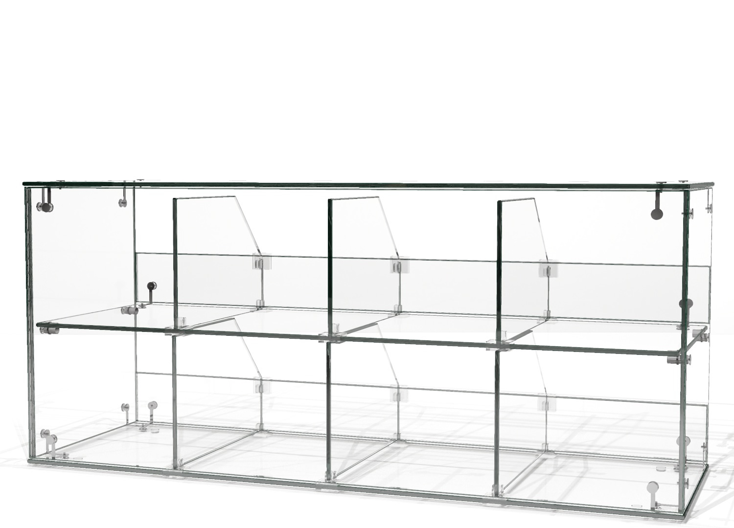 • Szklane przegrody umieszczone są na regulowanych transparentnych złączkach.