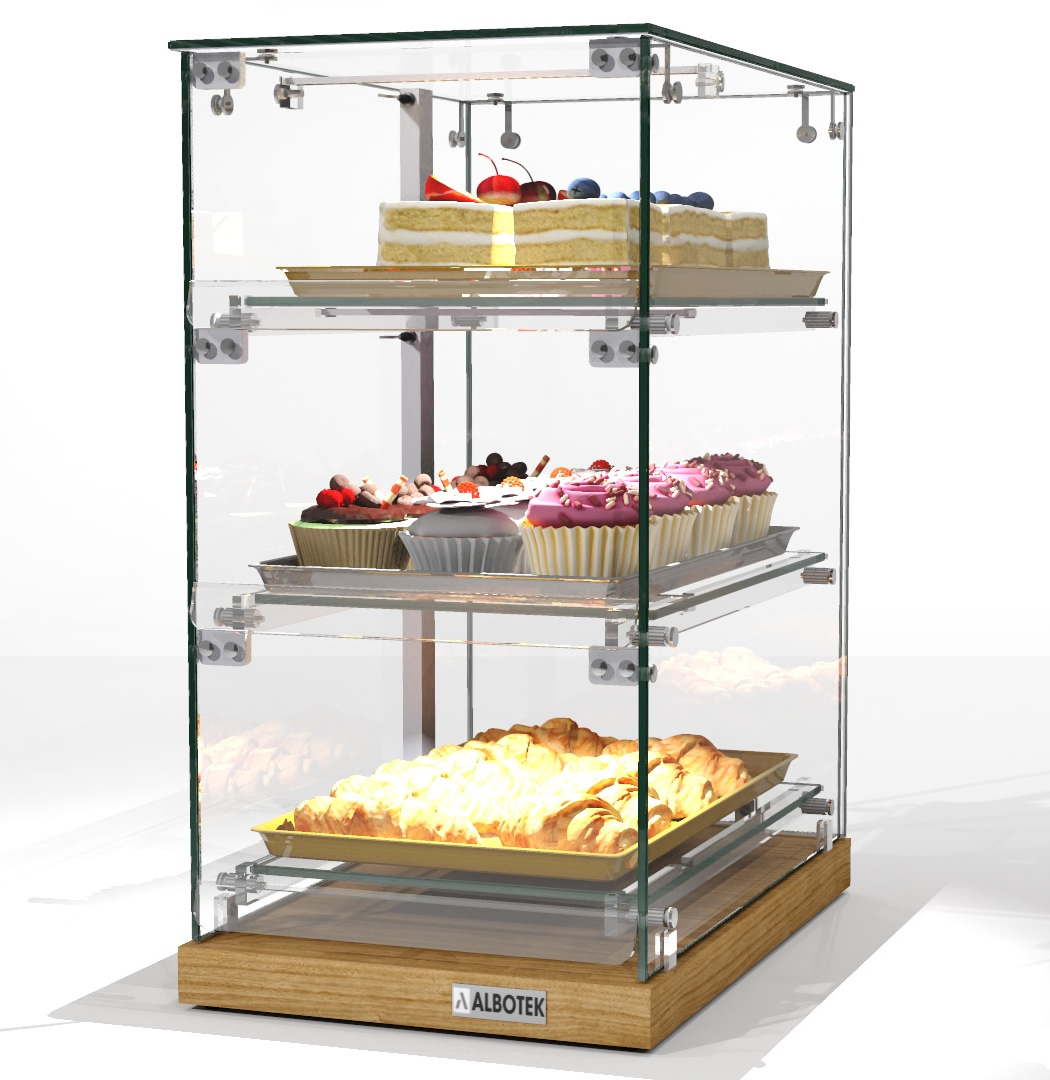 Witryna szklana na ciasta, kanapki i desery z praktycznymi klapkami uchylnymi, zapewniającymi łatwy dostęp do produktów