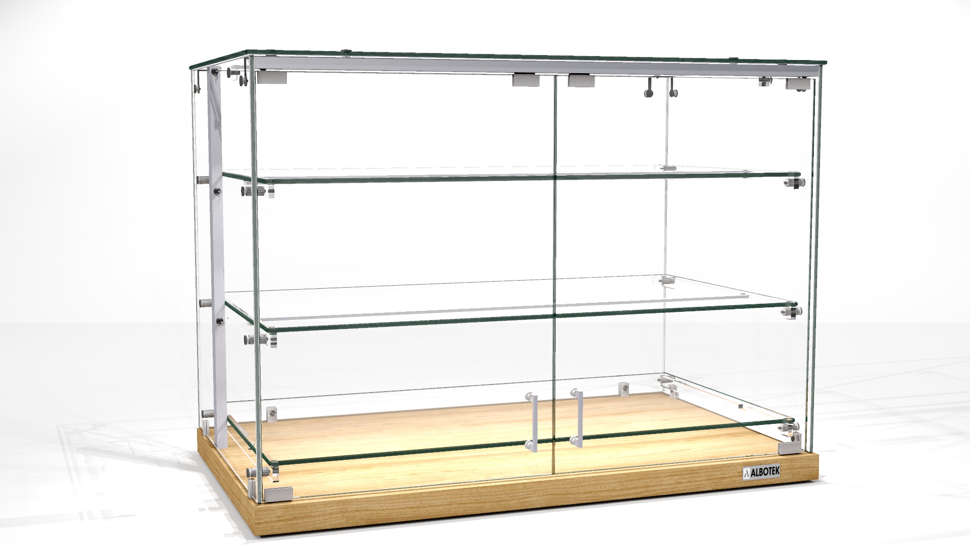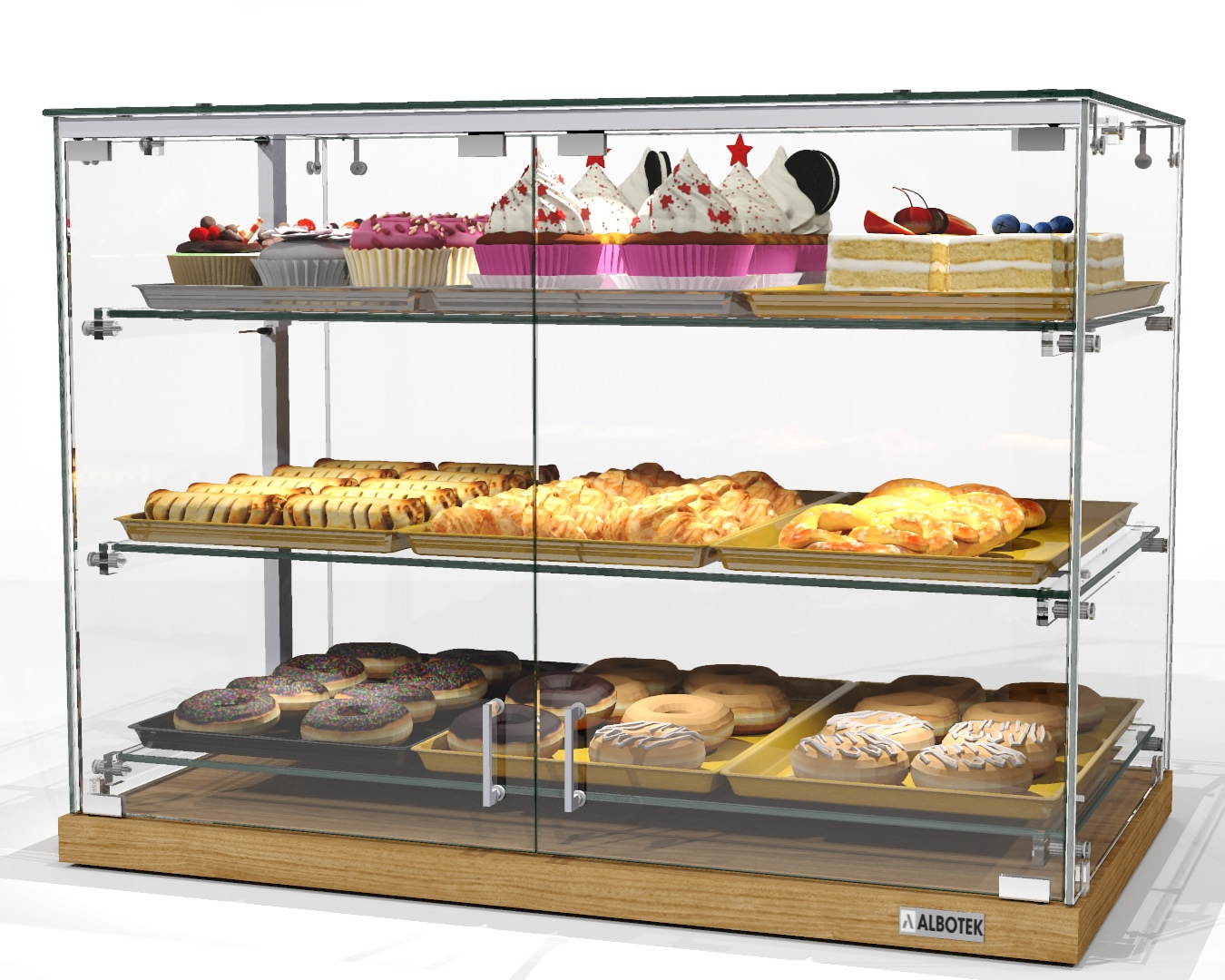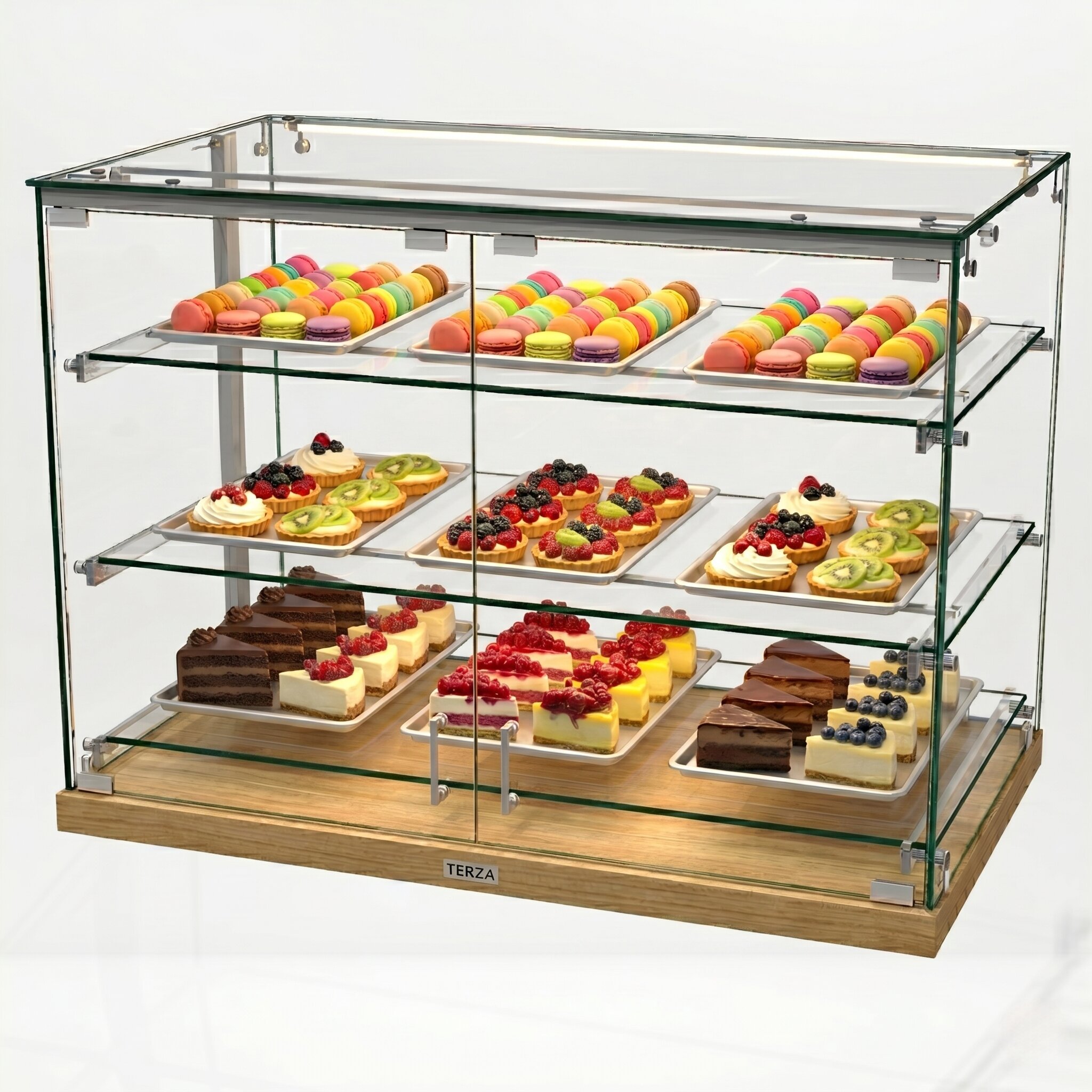 Witryna cukiernicza szklana z drzwiami SN 3 D to funkcjonalna i estetyczna witryna neutralna, idealna do prezentacji ciast, ciastek, deserów, kanapek oraz innych wyrobów piekarniczych. Zamykana tylna ścianka z drzwiami uchylnymi zapewnia ochronę produktów przed dostępem klientów, kurzem i zmianami temperatury – to doskonałe rozwiązanie do obsługi z zaplecza.