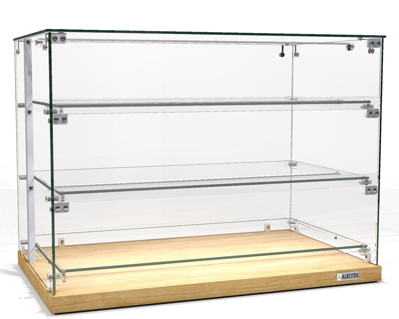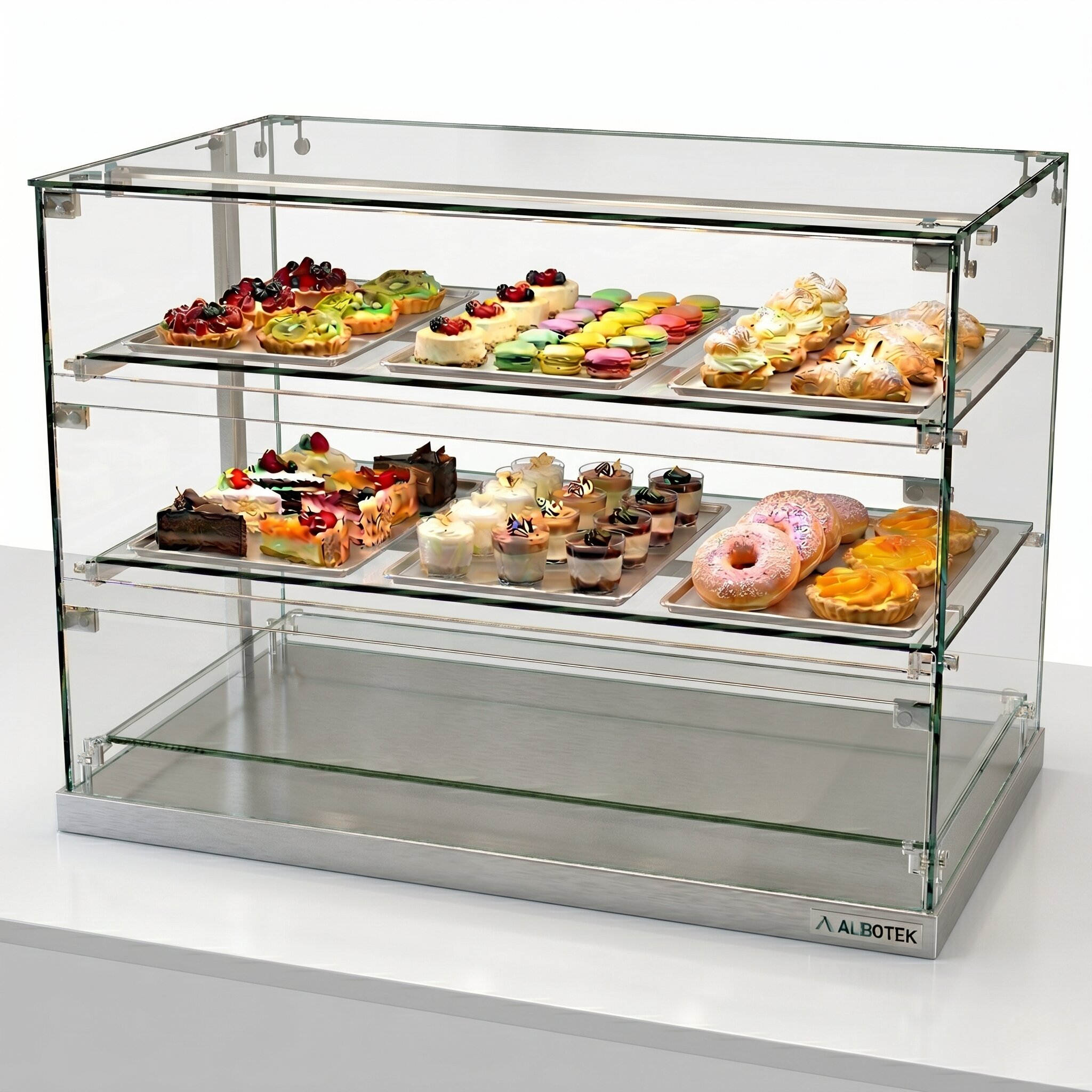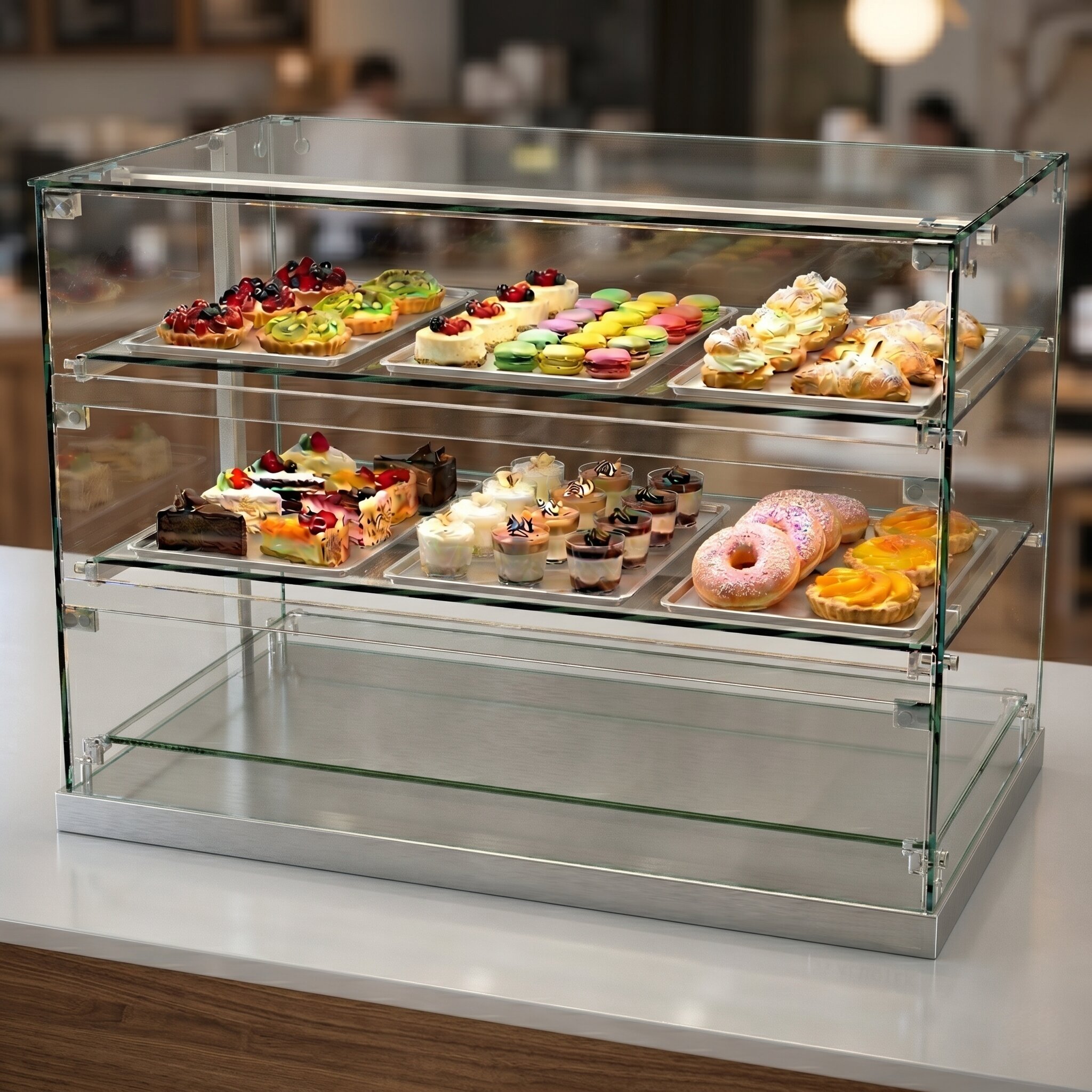 Witryna cukiernicza szklana z klapkami SN 3 K to elegancka, funkcjonalna witryna neutralna przeznaczona do estetycznej prezentacji ciast, ciastek, kanapek i innych wyrobów piekarniczych. Wyposażona w uchylne klapki z pleksi, które umożliwiają łatwy dostęp do produktów od frontu przy jednoczesnym ich zabezpieczeniu przed kurzem i dotykiem.